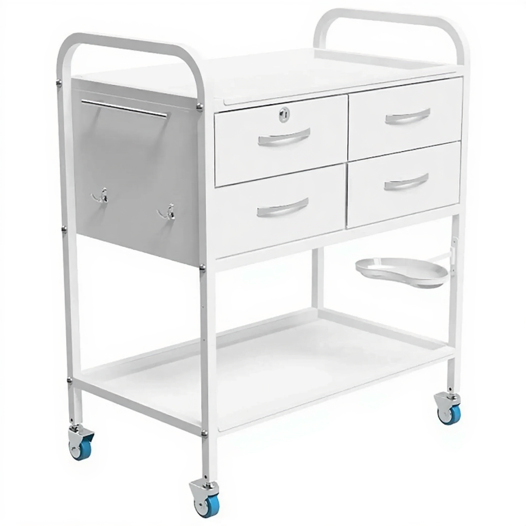 Стол инструментальный процедурный специальный СИПС (полки металл) — это многофункциональный процедурный стол, предназначенный для размещения инструмента, лекарственных препаратов и приборов в процедурных, смотровых и перевязочных кабинетах медицинских учреждений. Модель имеет каркас из профильной стальной трубы, полки из металла, выдвижную полку, почкообразный лоток и ящик с замком.
