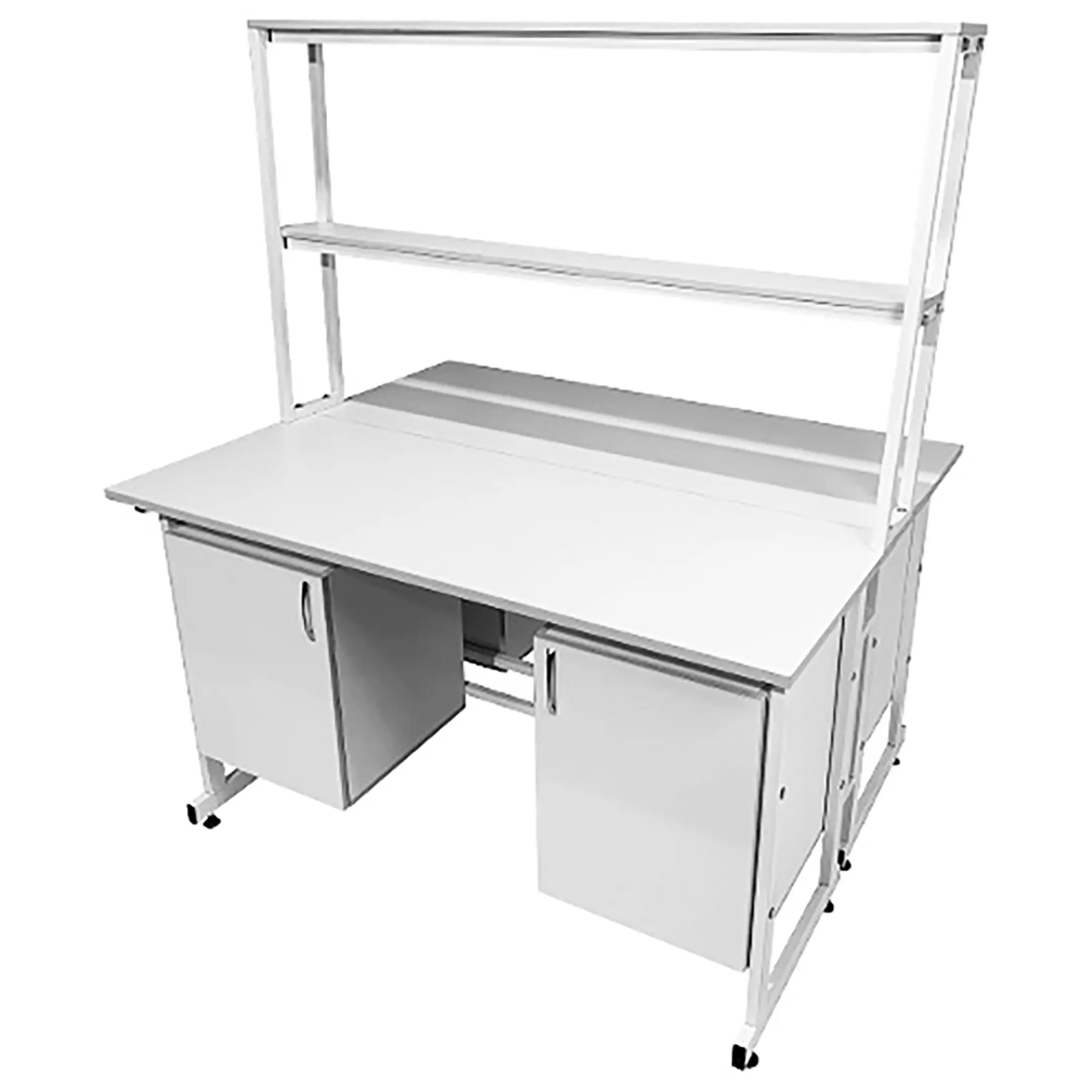 Стол лабораторный островной с надстройкой Сло 22.016 (белый) предоставляет возможность организации двух полноценных рабочих мест для сотрудников лабораторий и медицинских учреждений. Его конструкция способствует рациональному использованию пространства, обеспечивая максимальную эффективность в работе. Модель оснащена двумя рабочими местами, каждое с двумя подвесными тумбами, и центральной надстройкой с двумя полками. Каркас выполнен из стального профиля, столешницы из ЛДСП толщиной 22 мм.