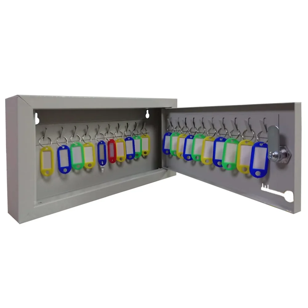 - Базовая, но эффективная система организации — двадцать пронумерованных ячеек и комплект брелков создают простую и наглядную систему. Это позволяет мгновенно находить нужный ключ, избегая путаницы в связках, и вести элементарный учет их выдачи, если это необходимо.