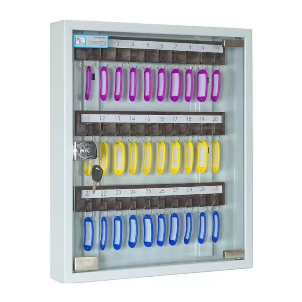 - Универсальная вместимость для рабочих мест и постов — система рассчитана на 30 ключей, что идеально подходит для организации хранения в отделе, на посту охраны, в диспетчерской или административном кабинете, где требуется поддерживать порядок для значительного, но не чрезмерного количества ключей.