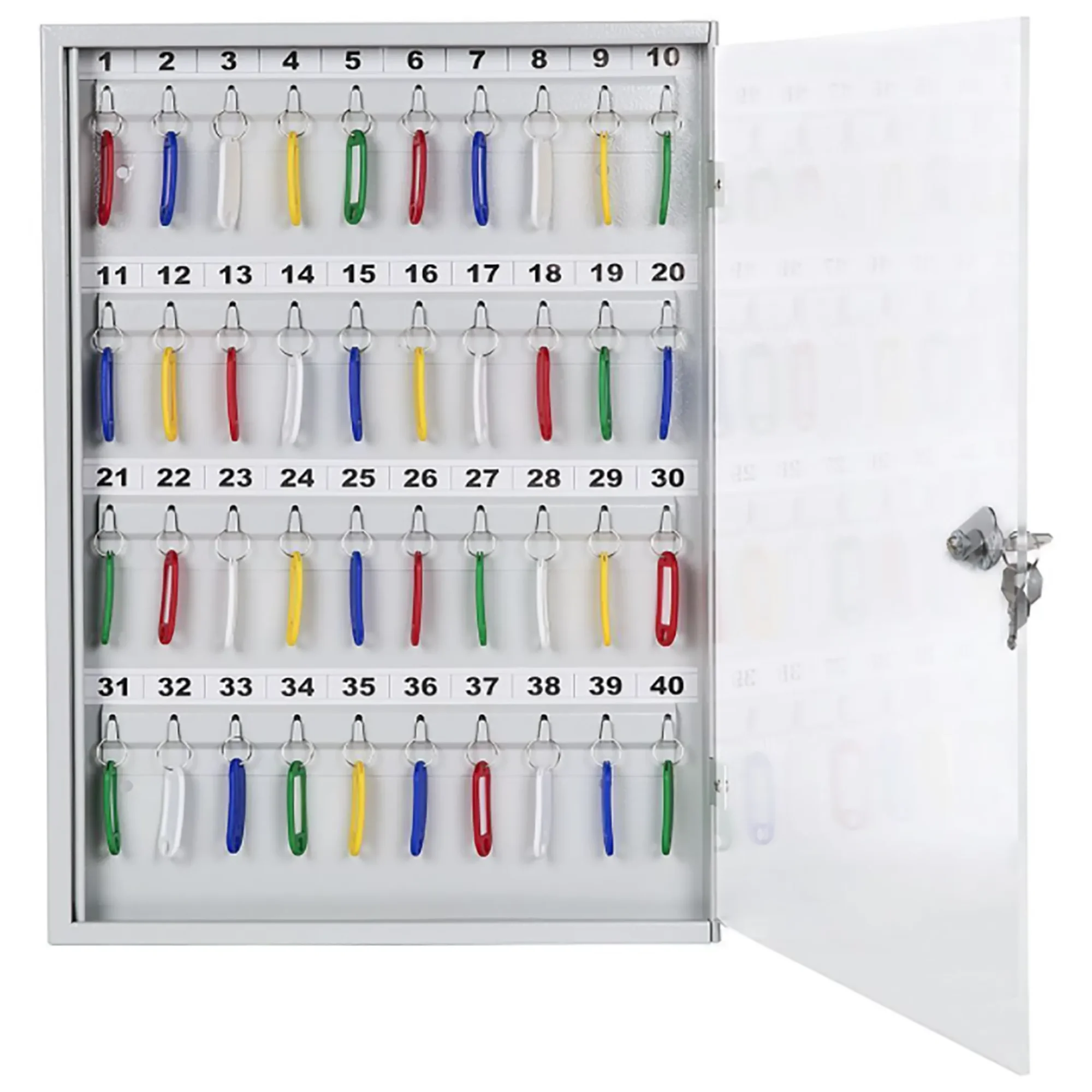 - Оптимальная вместимость для рабочих мест и постов — система рассчитана на 40 ключей, что идеально подходит для организации порядка на конкретном рабочем месте, в отделе, на посту охраны или в диспетчерской, где требуется систематизировать и контролировать значительный, но не чрезмерный набор ключей.