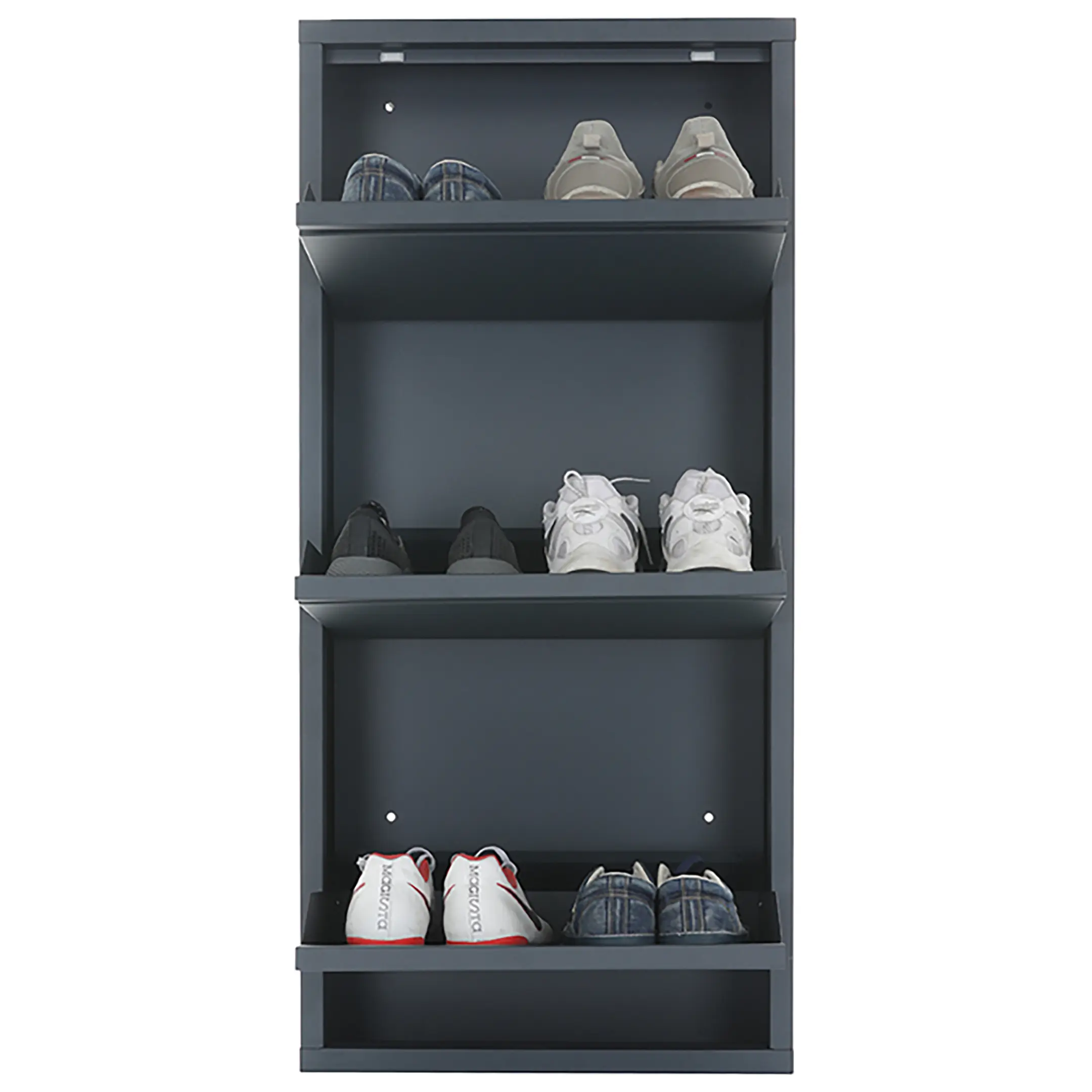 - Базовая вместимость — 3 открытые полки рассчитаны на хранение 3-6 пар обуви (в зависимости от способа размещения), что достаточно для одного человека или для хранения самой необходимой текущей обуви.