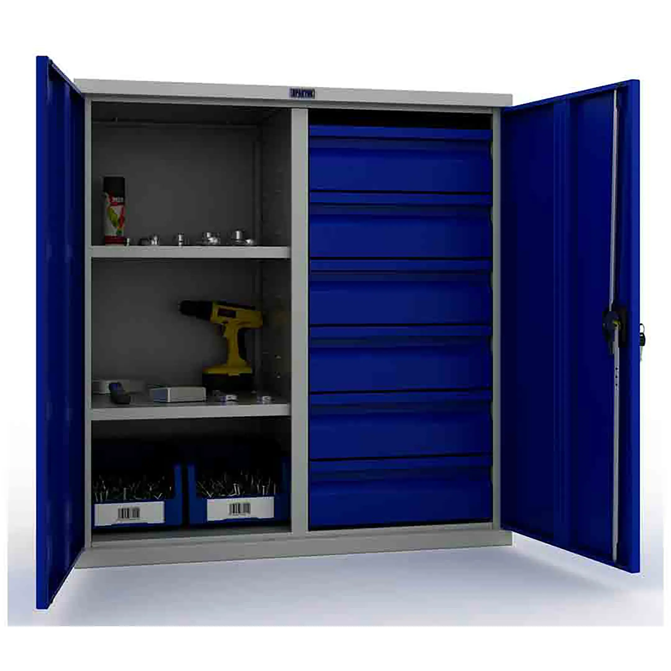 - Надежная защита содержимого — прочный стальной корпус и запирающиеся на замок двери обеспечивают защиту ценного инструмента от кражи, несанкционированного использования, а также от пыли и влаги в нерабочее время. Замок гарантирует базовый уровень безопасности.