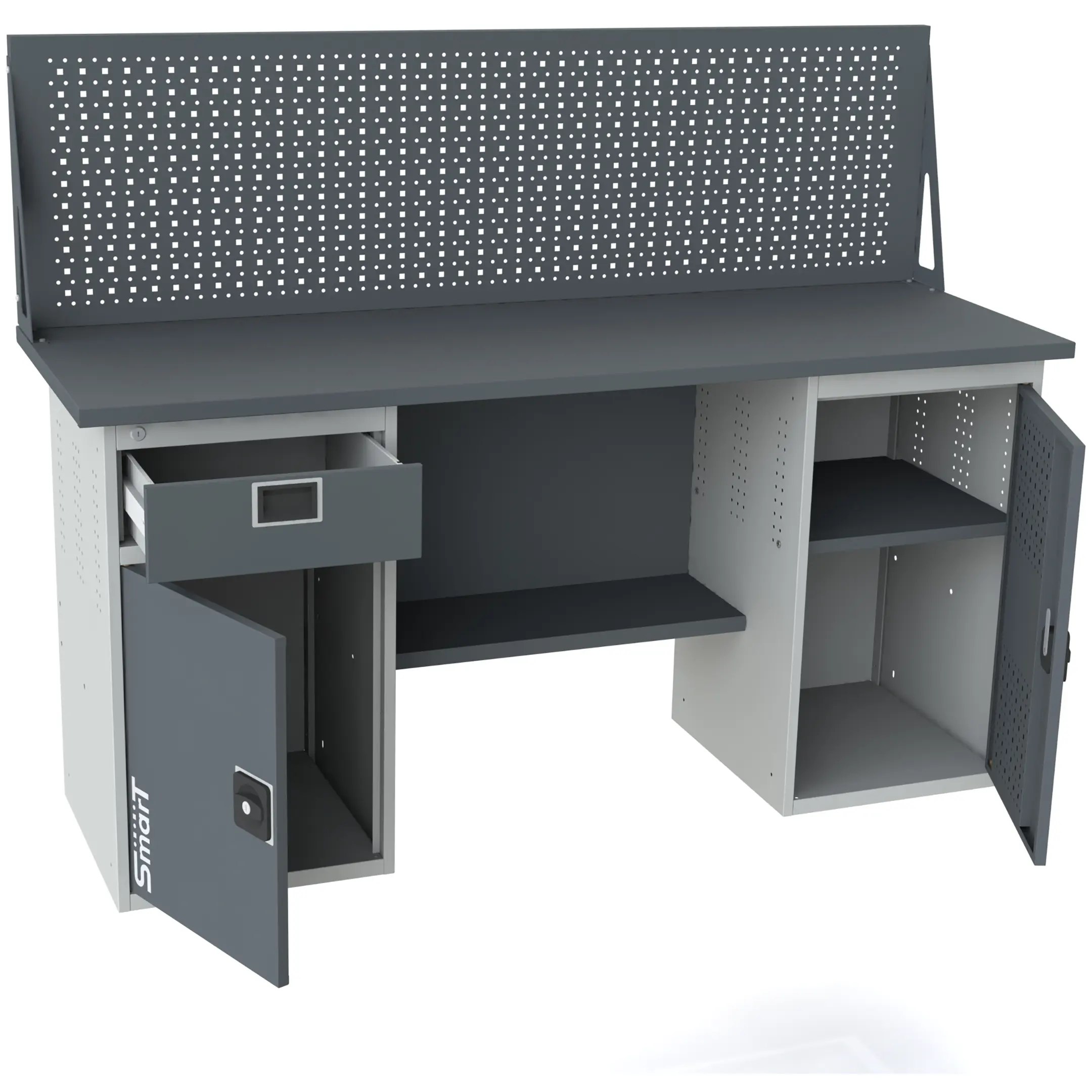 - Универсальная перфорация — внутренние стенки дверей и боковые стенки имеют перфорацию для размещения крючков и держателей инструмента.