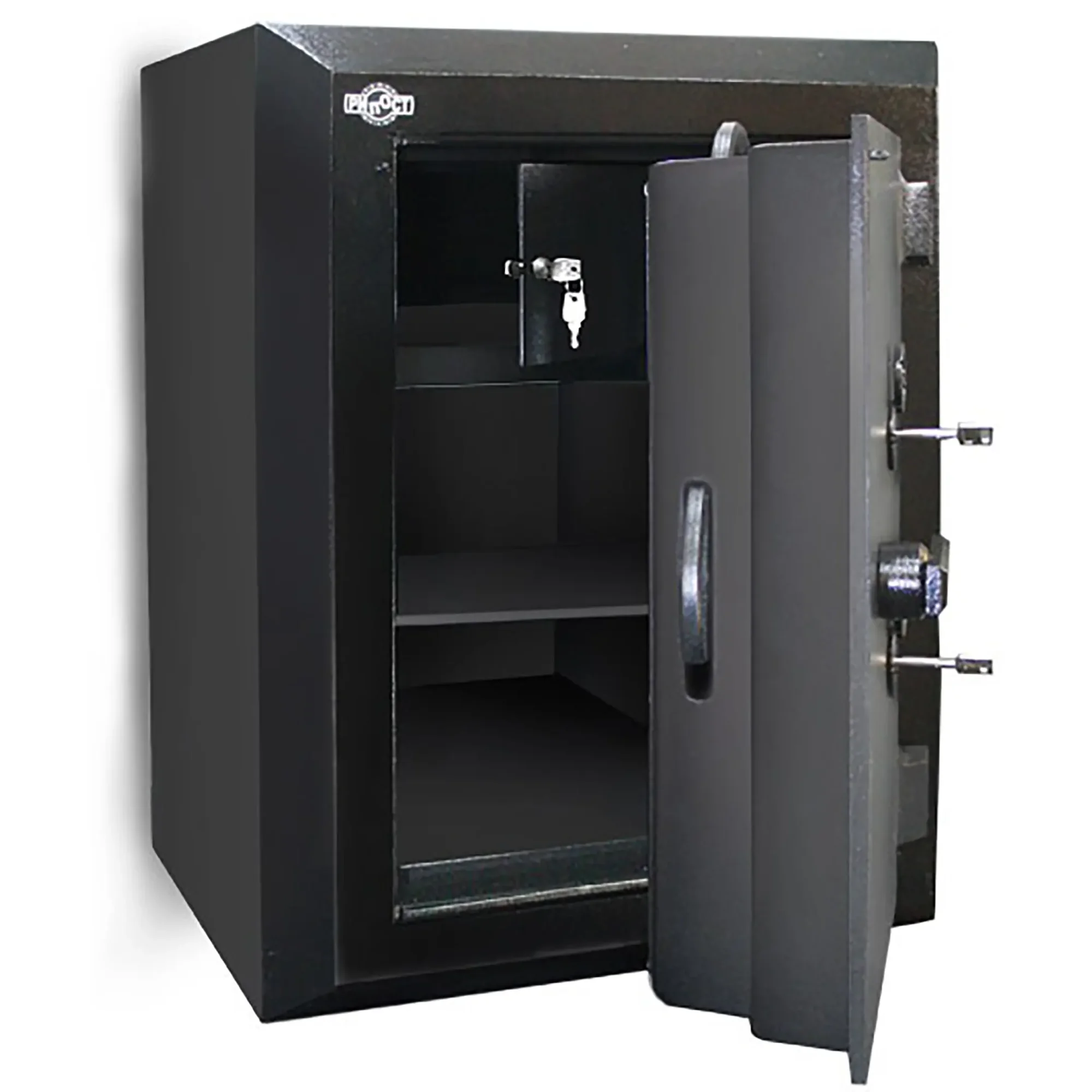 - корпус сейфа имеет усиленный двухслойный сварной стальной каркас, выполненный из листовой стали и заполненный специальным бетоном;