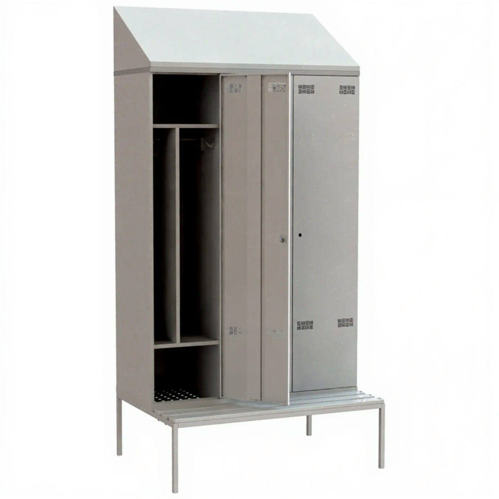 • Шкаф металлический для хранения одежды имеет сварную конструкцию. Для удобства проведения влажной уборки под шкафом модель установлена на подставку. Для удобства переодевания имеет скамью