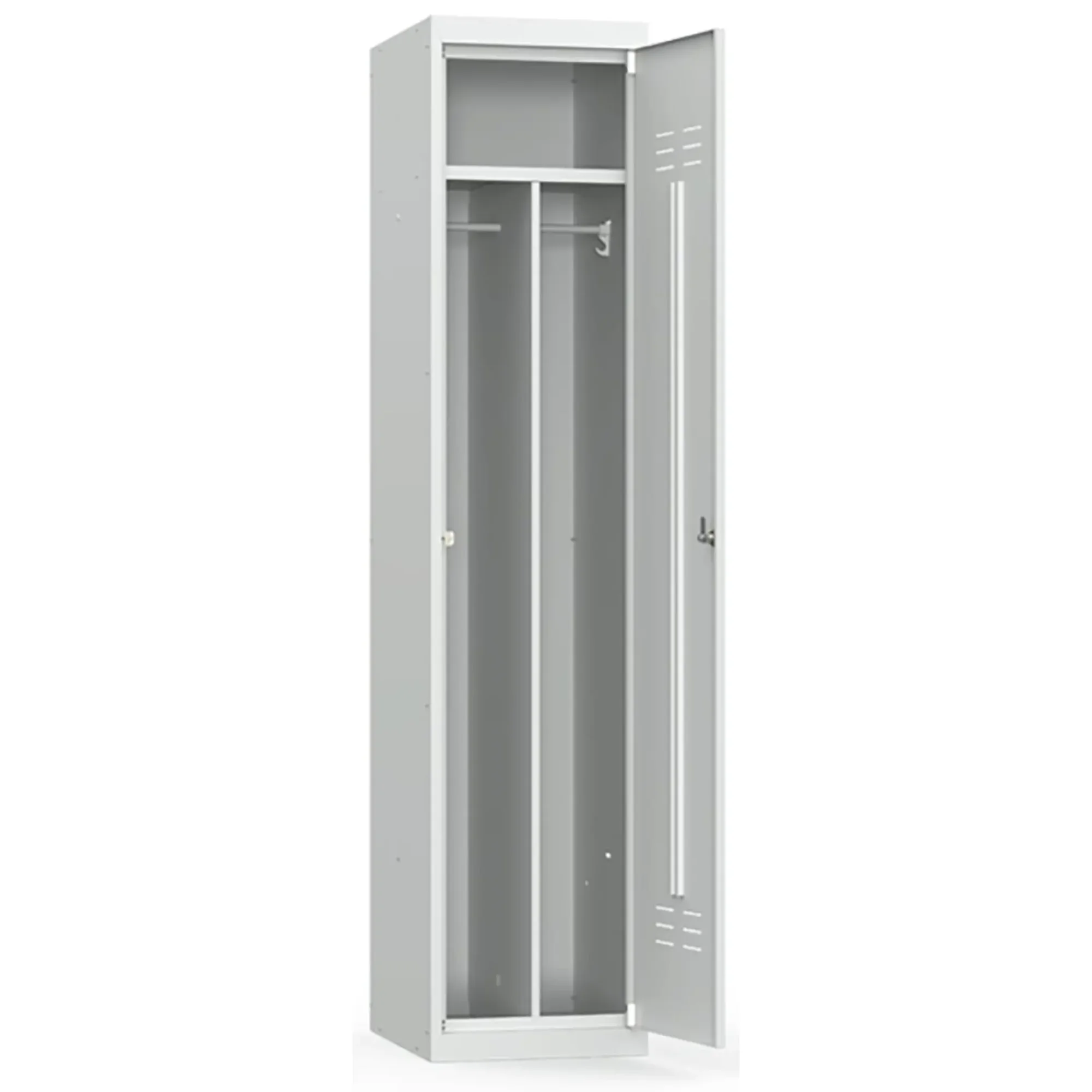 • Особенностью шкафа является внутренняя перегородка, создающая две раздевальные зоны, в каждой из которых имеются металлические перекладины для вешалок, два пластиковых крючка для одежды;