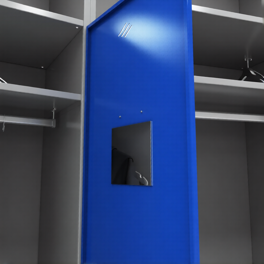 - Двери оснащены: крючками для полотенец - 2 шт., зеркальцем В150хШ150 мм, лотком В70хШ180хГ50 мм со скошенной передней стенкой для хранения мелочей (ключей, моб. телефона, очков и т.п.), держателями бирок В42хШ92 мм