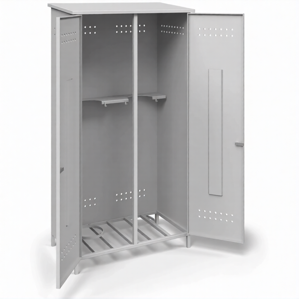 - Обеспечение требований пожарной безопасности — прочный металлический корпус служит барьером, изолирующим баллоны от источников открытого огня, искр и теплового излучения. Обязательная система естественной вентиляции (перфорация или вентиляционные решетки) обеспечивает необходимый воздухообмен для предотвращения накопления газа и образования взрывоопасной концентрации в случае утечки, что строго соответствует нормам ППР.