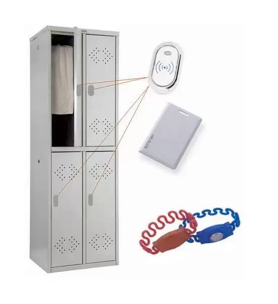 • влагозащищенные и термостойкие электронные ключи в виде резиновых растягивающихся браслетов используются для открывания и закрывания замка, а также возможно применение бесконтактных пластиковых Proximity Card HID вместо браслетов;