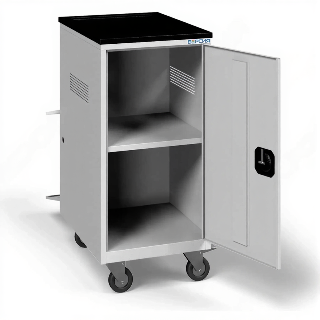 - Мобильность и базовая защита — оснащена колесами для перемещения и, как правило, защитным каркасом или бортами, который предотвращает падение ноутбуков во время движения. Часто имеет общий замок для ограничения доступа.